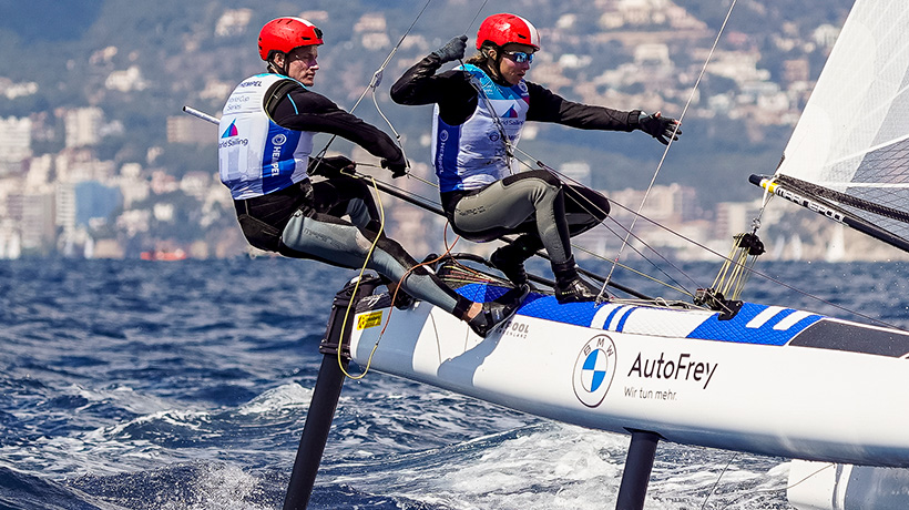 Sonnenschein und ideale Bedingungen mit acht bis elf Knoten Wind erwarteten die Segler*innen am Freitag bei der 52. Trofeo Princesa Sofia. Mit elf Punkten Rückstand auf die Top-10 gingen Lukas Haberl und Tanja Frank in die drei letzten Nacra-17-Rennen der Final Series. Das OeSV-Duo startete gleich fulminant und feierte den insgesamt dritten gemeinsamen Wettfahrtsieg. Mit zwei weiteren Top-10-Ergebnissen sicherten sich die beiden als Gesamtneunte auch die Teilnahme am Medal-Race. „Es ist sehr schön, dass wir gerade in dieser entscheidenden Phase der Regatta solch eine Leistung abliefern konnten. In der ersten Wettfahrt sind wir mit anderen Booten knapp zur Luv-Tonne gekommen und haben den Vorsprung immer weiter ausgebaut. Das hat sich sehr gut angefühlt, wir waren vom Speed voll dabei. Im zweiten Rennen waren wir auf der falschen Seite, weil wir nicht wenden konnten. Und trotzdem ist uns ein gutes Ergebnis gelungen. In der letzten Wettfahrt hatten wir auf der letzten Vorwind ein technisches Problem und büßten dadurch ein paar Plätze ein. Dennoch sind wir sehr zufrieden und werden morgen noch einmal voll angreifen,“ zeigt sich Vorschoterin Frank erfreut.